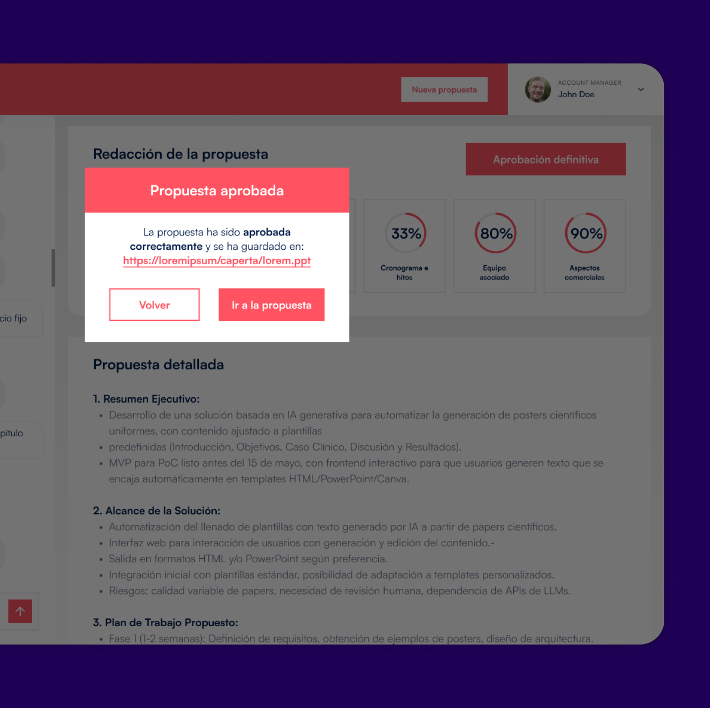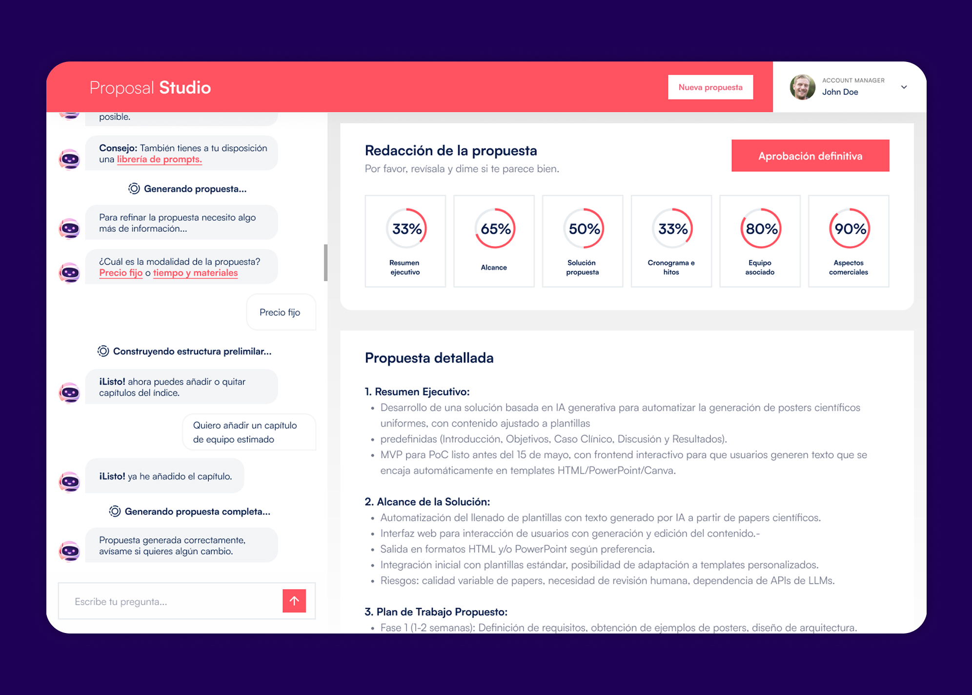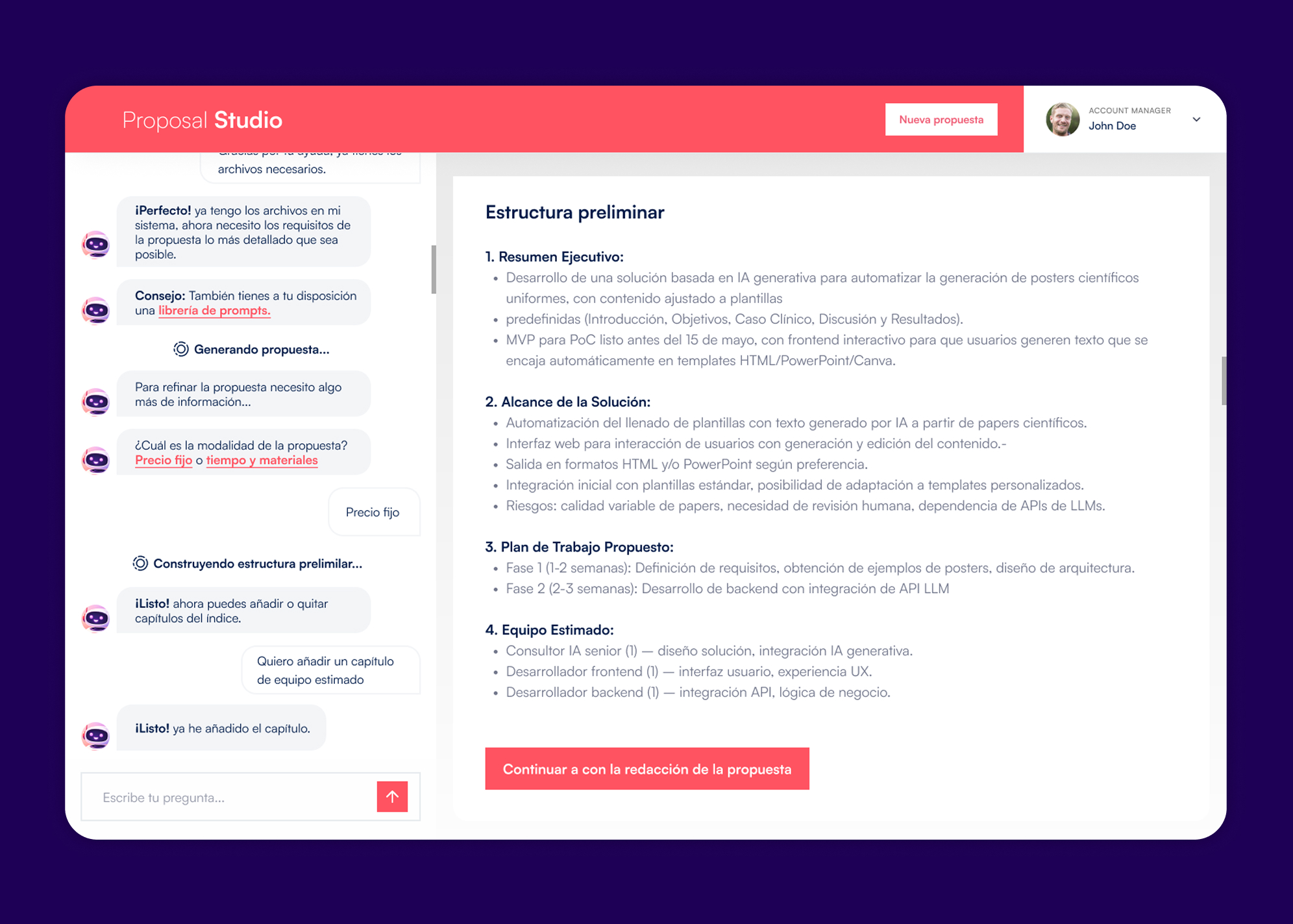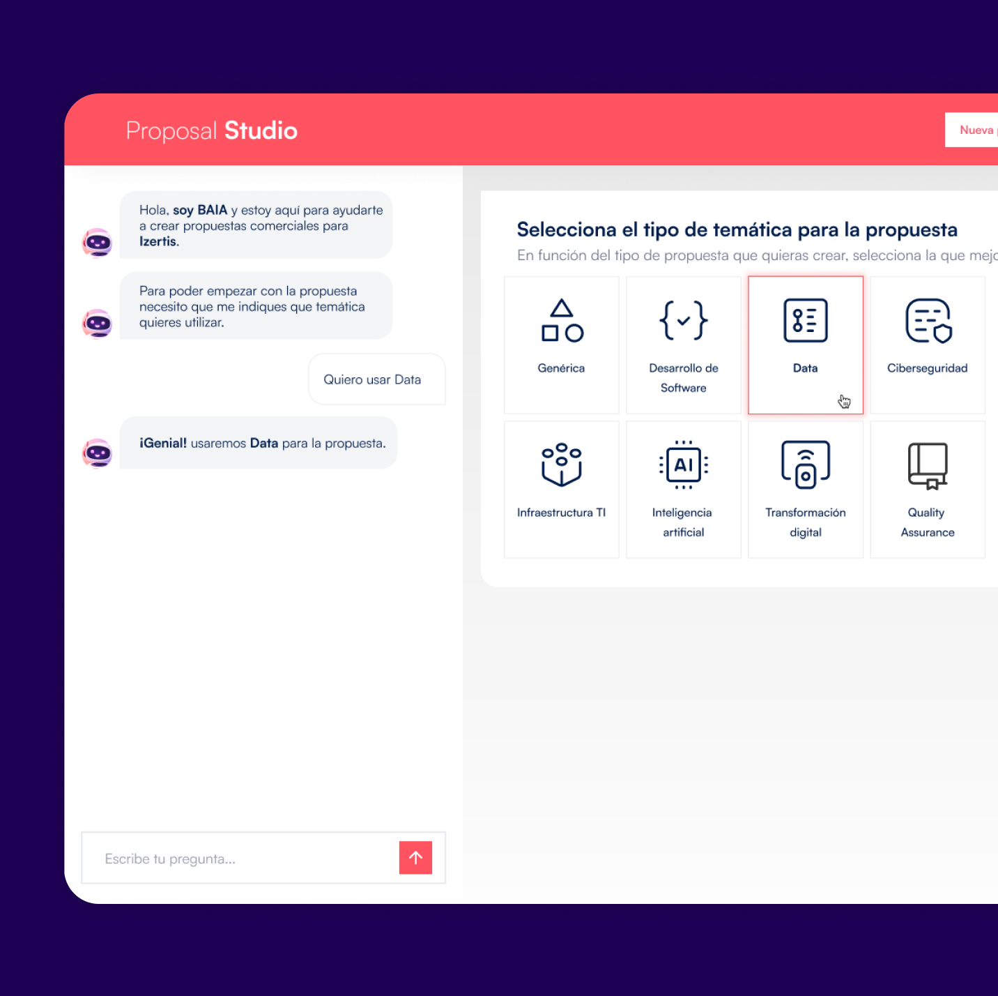 A través del análisis de documentación corporativa, casos de éxito, portfolio de servicios, metodologías y propuestas anteriores, la IA es capaz de generar borradores de propuestas comerciales adaptadas a las necesidades específicas de cada cliente. La herramienta permite ahorrar tiempo, mejorar la coherencia del mensaje comercial y aumentar la calidad de las propuestas, alineándolas con la estrategia y capacidades reales de la empresa.